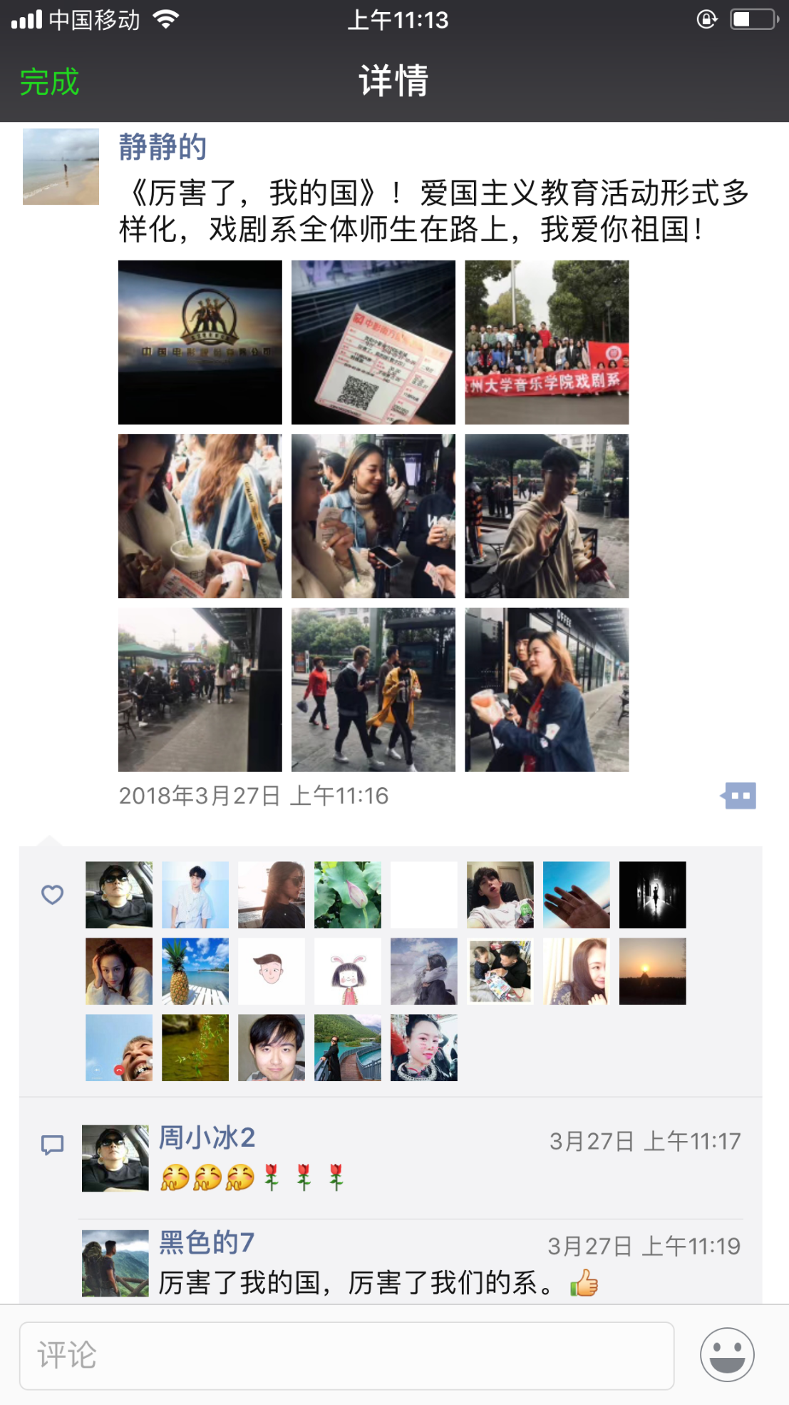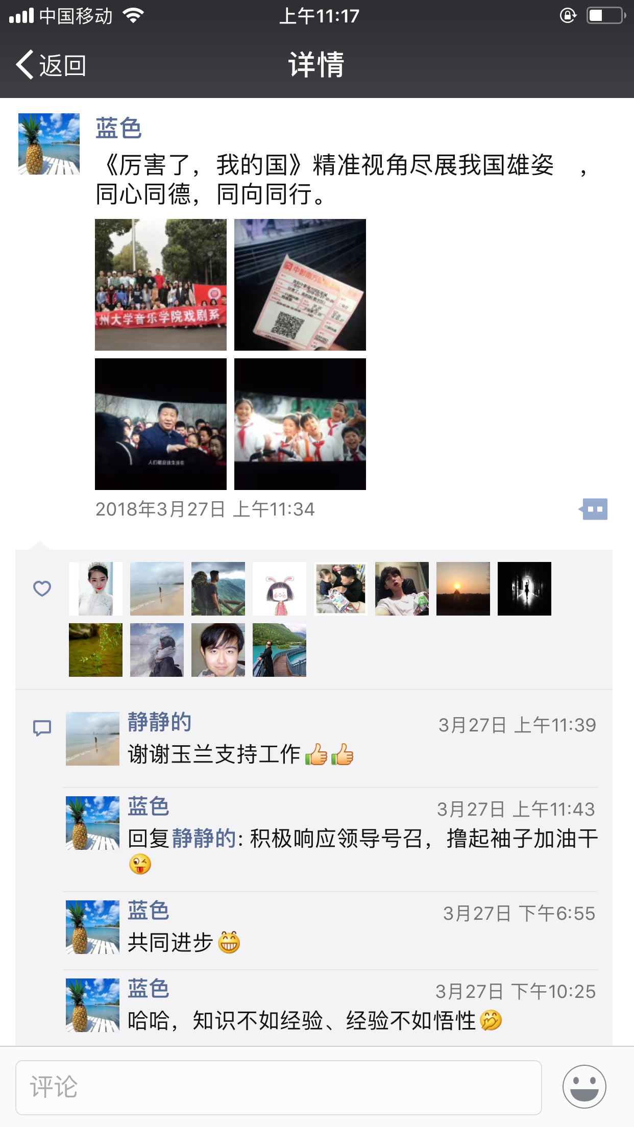 我們的朋友圈那一天被這種深情淹沒(méi) 大家紛紛在表示一定要在自己的崗位上更加努力,在自己的學(xué)習(xí)中更加用功,按照黨的十九大宏偉藍(lán)圖和發(fā)展方略,擼起袖子加油干,為國(guó)家獻(xiàn)出自己的微薄力量。 |