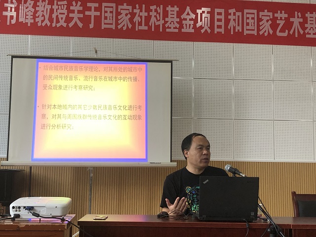 輔導(dǎo)報(bào)告會(huì)上,趙書峰教授在詳細(xì)介紹國(guó)家社科基金項(xiàng)目和國(guó)家藝術(shù)基金項(xiàng)目的種類、立項(xiàng)分布情況、評(píng)審流程的基礎(chǔ)上,結(jié)合貴州地域民族民間文化藝術(shù)的特點(diǎn),從選題視角、申報(bào)論證、注意事項(xiàng)等方面向與會(huì)教師講述了如何做好課題申報(bào)工作,并分享了自己國(guó)家社科基金項(xiàng)目和國(guó)家藝術(shù)基金項(xiàng)目申報(bào)的成功經(jīng)驗(yàn)。