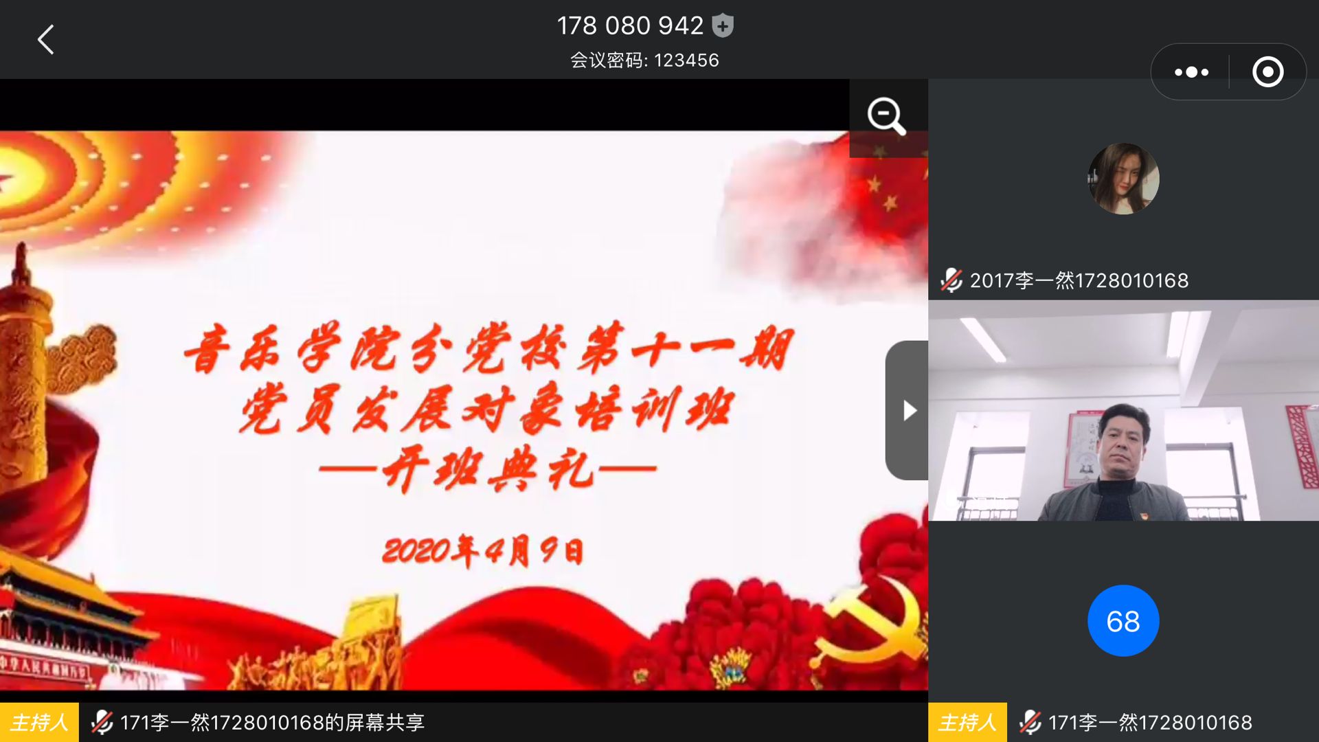 根據(jù)貴大黨校[2020]2號(hào)文件精神和要求,鑒于當(dāng)前疫情防控形勢(shì),2020年4月9日中午13:30分,音樂學(xué)院分黨校第十一期黨員發(fā)展對(duì)象培訓(xùn)班開班典禮在學(xué)院802會(huì)議室以“騰訊會(huì)議”形式舉行。音樂學(xué)院黨委書記范斌同志、黨委副書記張波同志及第十一期黨員發(fā)展對(duì)象培訓(xùn)班共五十三名學(xué)員參加開班典禮。開班典禮由音樂學(xué)院黨委委員、組織員高琛同志主持。