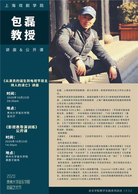 10月23日上午9:30,貴州大學(xué)音樂(lè)學(xué)院的教學(xué)樓中,雷動(dòng)的掌聲響了整日。追尋著渾厚磁性的聲音,記者看到上海戲劇學(xué)院副教授、碩士生導(dǎo)師、影視學(xué)院研究生工作辦公室主任包磊正在給學(xué)生們授課,上午講座的主題是《從演員的誕生到電視主持人的消亡》。