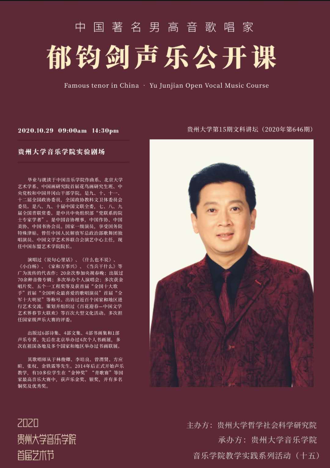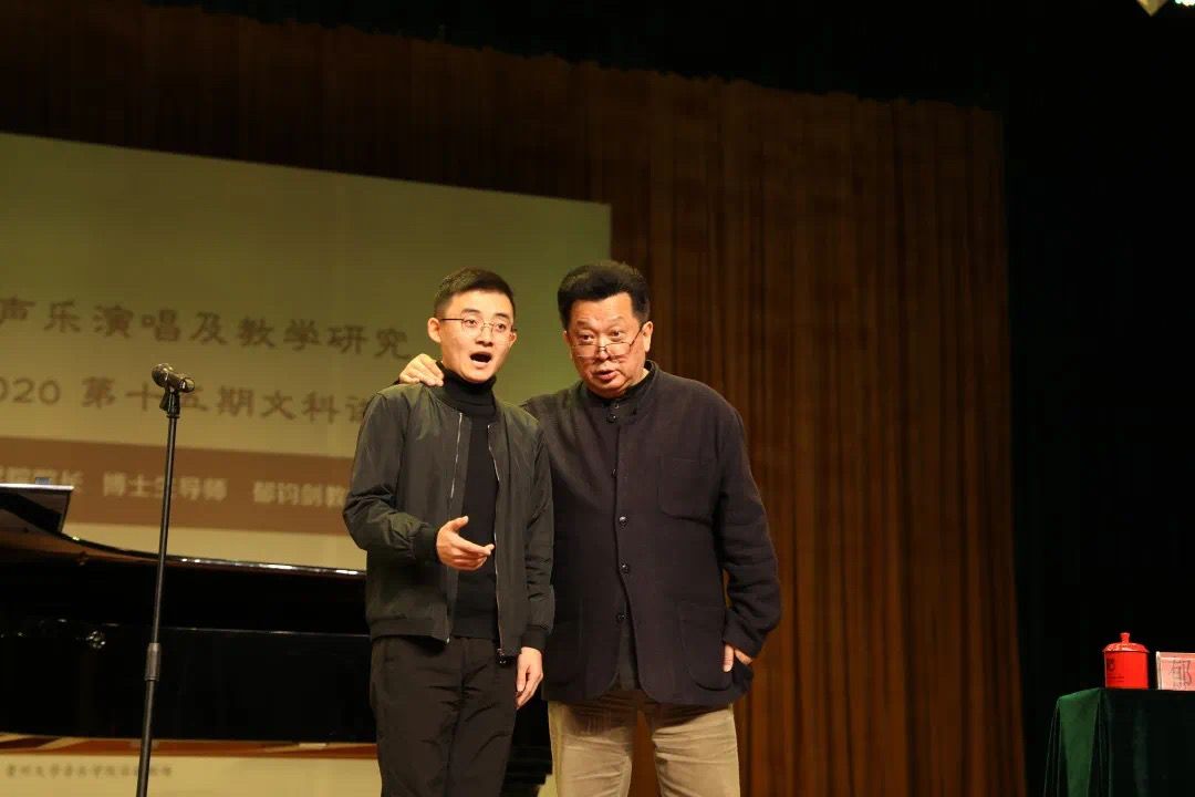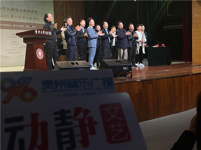 2020年10月29日上午9:00開始,在貴州大學音樂學院實驗劇場里歌聲悠揚,掌聲雷動。中國東盟藝術學院院長、博士生導師、經典歌曲《小白楊》的演唱者——郁鈞劍教授,正在給貴州大學音樂學院的老師和同學們授課,現場座無虛席。
