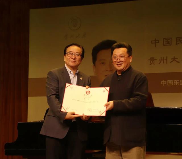 最后,貴州大學黨委書記李建軍上臺為郁鈞劍老師頒發(fā)聘書,聘請郁鈞劍老師為貴州大學音樂學院客座教授,并為其佩戴貴州大學校徽。