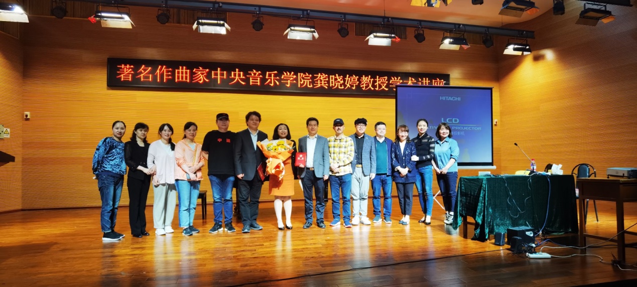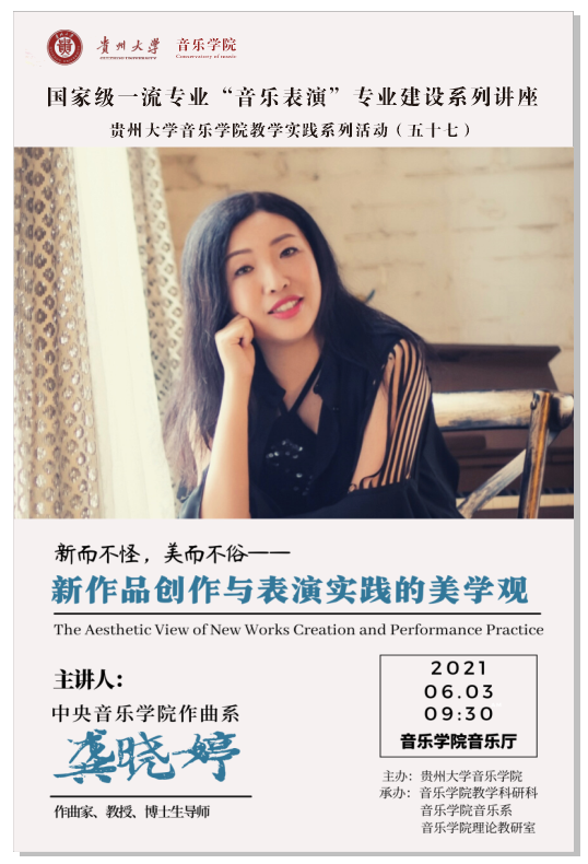 2021年6月3日上午09:30,著名作曲家中央音樂學院龔曉婷教授在貴州大學音樂學院音樂廳舉行學術講座。音樂學院黨委書記范斌﹑黨委副書記張波﹑副院長青科及音樂系﹑教學科研科﹑理論教研室的領導﹑老師和同學們參加了講座。
