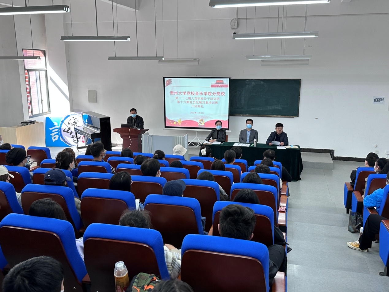 2022年11月2日中午13:00,貴州大學(xué)音樂學(xué)院在學(xué)院106階梯教室舉行了“音樂學(xué)院分黨校第三十七期入黨積極分子暨第十六期黨員發(fā)展對象培訓(xùn)開班典禮”。音樂學(xué)院黨委書記范斌同志、黨委副書記張波同志、本期79名入黨積極分子和19名黨員發(fā)展對象學(xué)員參加了開班典禮,開班典禮由學(xué)院黨委委員、組織員同時(shí)也是本期培訓(xùn)班班主任高琛同志主持。
