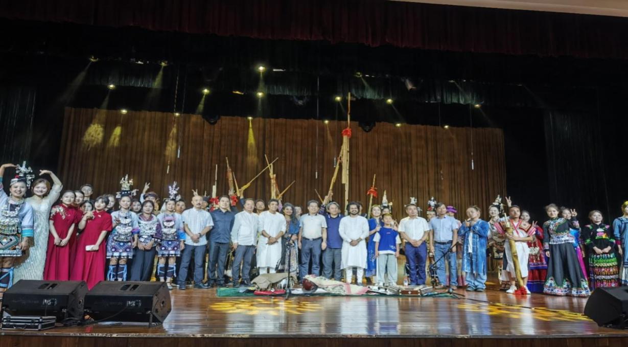 2023年8月24日19:30至21:30,“文明之約---中印文化交流音樂會”在音樂學(xué)院實驗劇場舉行,由印度的兩位音樂家和貴州大學(xué)音樂學(xué)院侗歌、蘆笙音樂方向的師生同臺獻(xiàn)藝,表演了長大久遠(yuǎn)、神秘空靈的印度古典音樂和貴州多彩炫聽的侗族大歌、琵琶歌、蘆笙樂舞。貴州大學(xué)杰出校友、中央音樂學(xué)院音樂學(xué)系主任、世界民族音樂專業(yè)博士研究生導(dǎo)師安平教授、貴州大學(xué)音樂學(xué)院黨委書記范斌、院長穆維平及音樂系師生300余人出席了音樂會。音樂學(xué)院優(yōu)秀校友、知名歌手蝶當(dāng)久演唱的《對歌對到日落坡》等苗族歌曲,外聘教師、青年蘆笙演奏家楊昌杰帶領(lǐng)蘆笙隊的《踩蘆笙》表演將音樂會推向精彩紛呈的高潮和激情難抑的尾聲。最后,“文明之約---中印文化交流音樂會”在中印音樂家和師生共同即興合作表演的優(yōu)美旋律和節(jié)地而舞的腳步聲中落下帷幕。