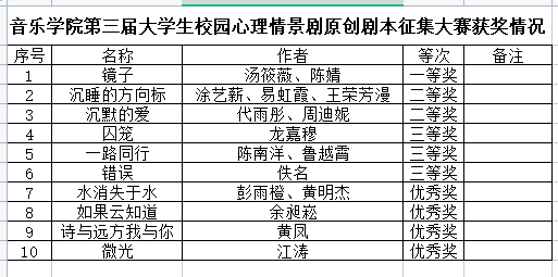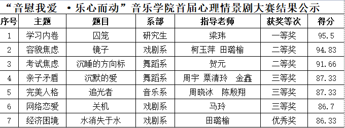 音樂學院第三屆大學生校園心理情景劇原創(chuàng)劇本征集大賽獲獎情況